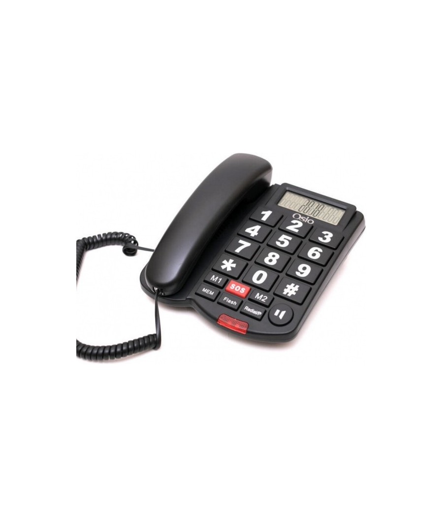 Ενσύρματο τηλέφωνο Osio OSWB-4760B με μεγάλα πλήκτρα για ευκολία στη χρήση από άτομα μεγάλης ηλικίας ή με μειωμένη όραση. Διαθέτει LED που αναβοσβήνει όταν σας καλούν, δυνατό μικρόφωνο και ακουστικό και μεγάλη οθόνη. Επίσης διαθέτει 2 κουμπιά ταχείας κλήσεις και κουμπί έκτακτης ανάγκης για κλήσεις με το πάτημα ενός κουμπιού και 10 μνήμες για τους σημαντικούς σας αριθμούς.