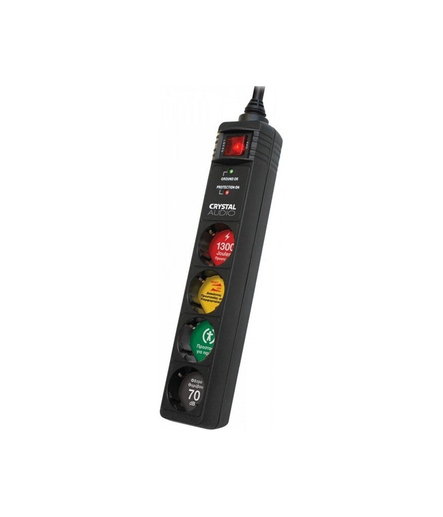Πολύπριζο Ασφαλείας Crystal Audio CP4-1300-70 4 Θέσεων, 1300 Joule. 100% προστασία από βραχυκυκλώµατα και υπερφορτώσεις και στις δύο γραµµές - φάση και ουδέτερο. 70dB προστασία σπό Ράδιο-Παρεµβολές. Ταχείας απόκρισης βαρίστορς οξειδίου µετάλλου (MOV). Μονωτικό υλικό επικάλυψης MOV και θερµικής ασφάλειας. Ρελέ προστασίας.