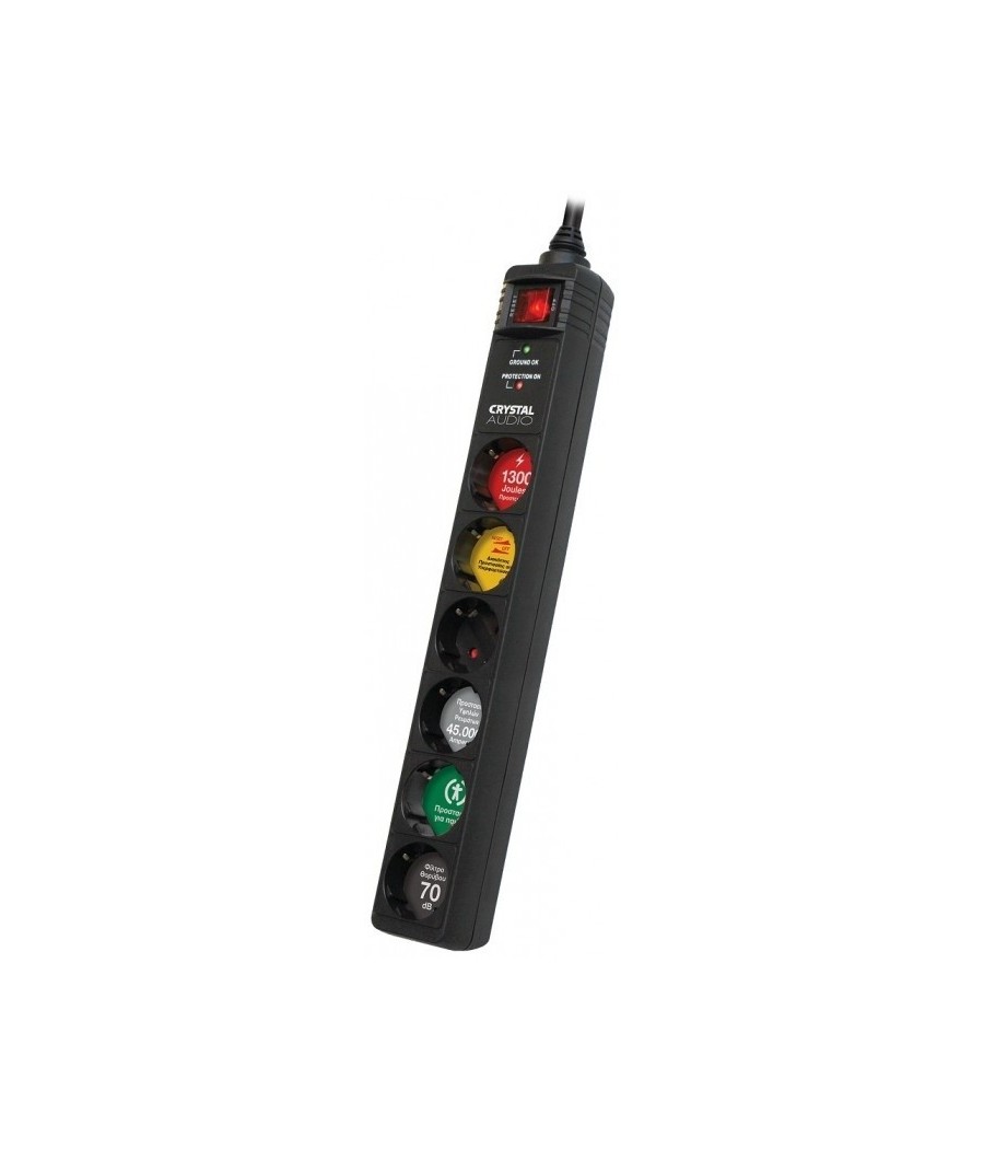 Πολύπριζο Ασφαλείας Crystal Audio CP6 6 Θέσεων, 1300J/70dB. 100% προστασία από βραχυκυκλώµατα και υπερφορτώσεις και στις δύο γραµµές - φάση και ουδέτερο. Tαχείας απόκρισης βαρίστορς οξειδίου µετάλλου (MOV). Μονωτικό υλικό επικάλυψης MOV και θερµικής ασφάλειας. 70dB προστασία σπό Ράδιο-Παρεµβολές. Ρελέ προστασίας.