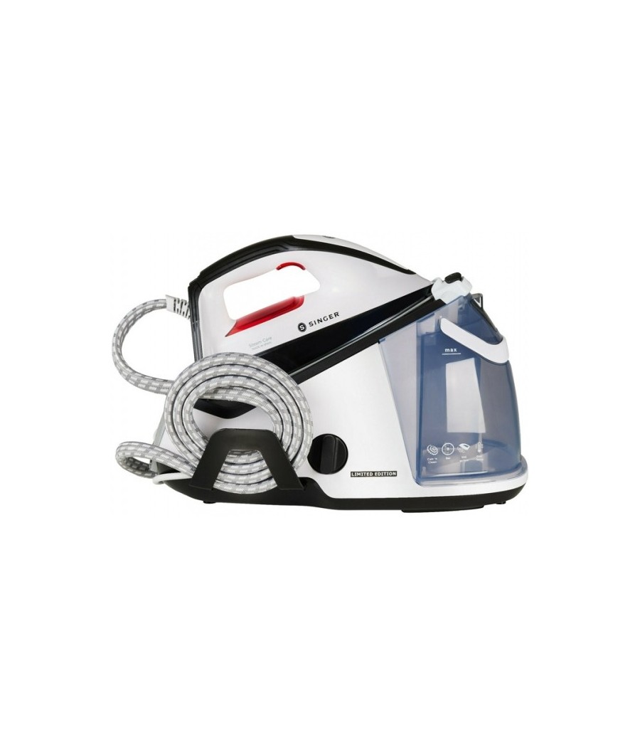 Σύστημα σιδερώματος Singer με λειτουργία eco σε όλα τα προγράμματα πίεση ατμού 8 bar και σύστημα SecureLock που στερεώνει το σίδερο στο σύστημα σιδερώματος για βελτιωμένη ασφάλεια κατά τη μεταφορά και την αποθήκευση.